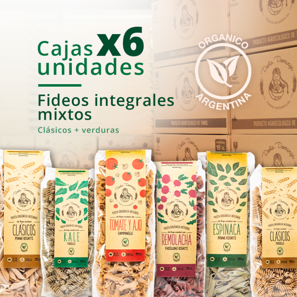 Disfrutá una selección exclusiva de nuestras pastas orgánicas elaboradas en Tandil. Este Box incluye 6 paquetes de fideos 100% integrales, hechos con trigo candeal y verduras orgánicas seleccionadas.